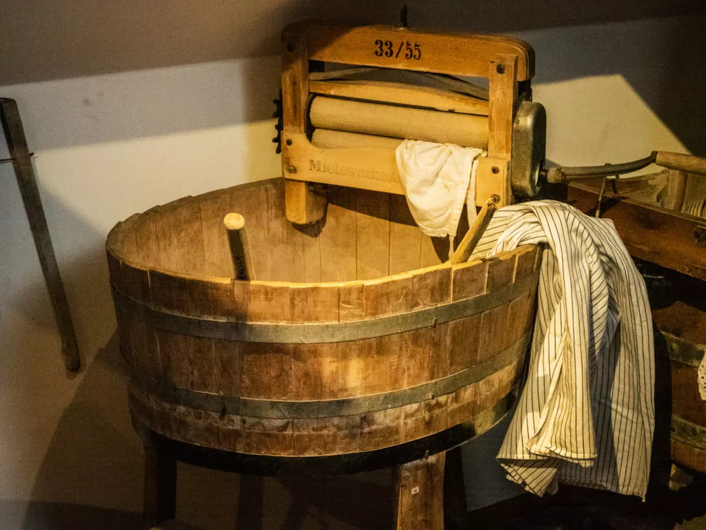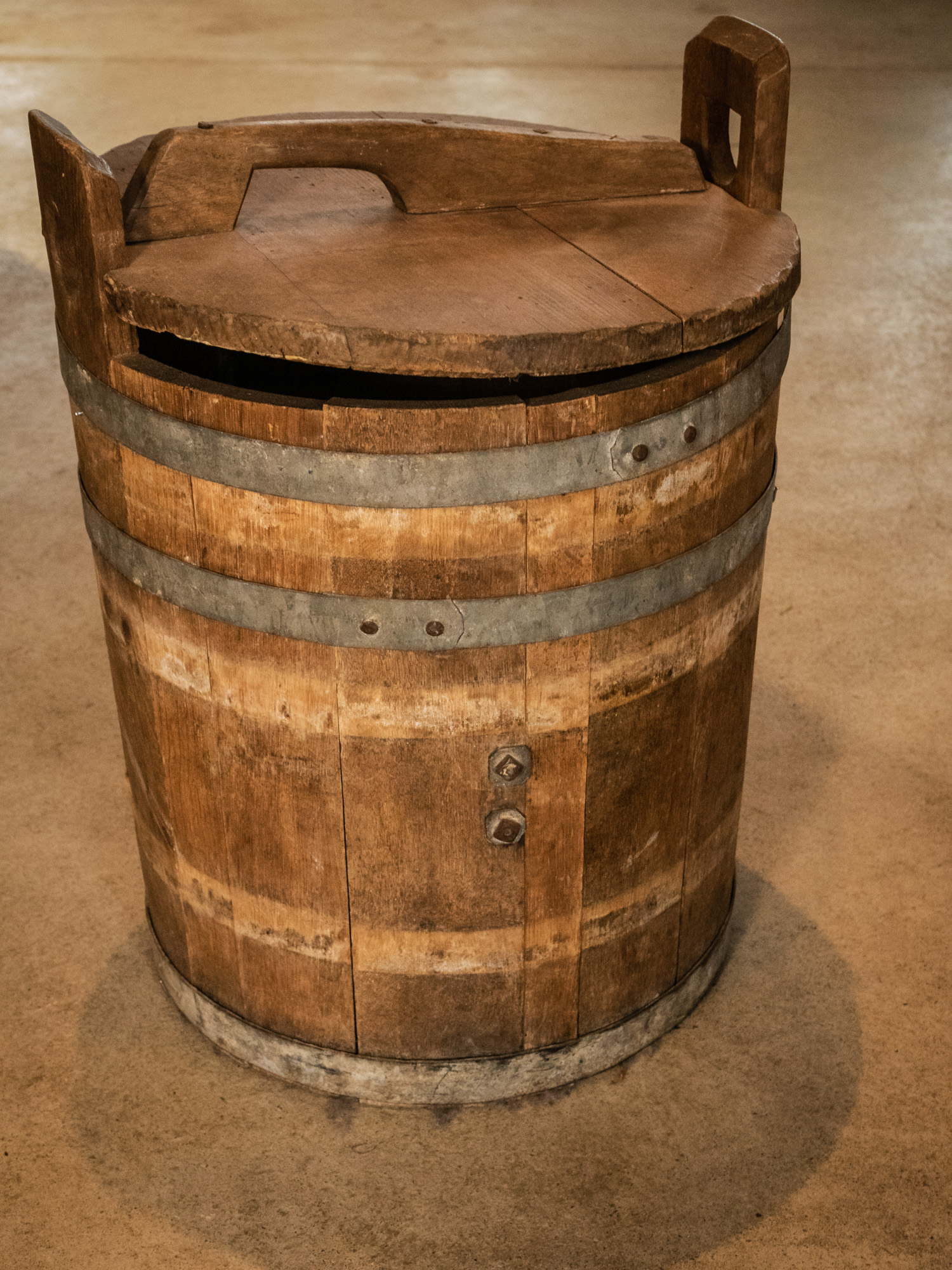 Die Fässer hier unterscheiden sich in Form und Größe, je nachdem wofür sie verwendet wurden. Allen gemeinsam ist, dass sie aus länglichen Holzstücken, den sogenannten Dauben, zusammengesetzt sind. Der Böttcher braucht für seine Arbeit spezielle Werkzeuge und viel Erfahrung. Schließlich müssen die Dauben und alle anderen Teile so präzise gefertigt werden, dass das Fass am Ende hundertprozentig dicht ist. Zuerst werden die Dauben hergestellt - meist aus astlosem Eichenholz - und mit einem Montagereifen zusammengehalten. Wenn Sie genau hinschauen, sehen Sie, dass die Fässer leicht gewölbt sind und nach oben und unten hin enger werden. Dafür müssen die Dauben gebogen werden. Eine schwierige und anstrengende Arbeit. Mehrfach werden die Hölzer nass gemacht und über einem Feuer erwärmt, bis sie geschmeidig und biegsam geworden sind. An dem Fassrumpf, der jetzt seine bauchige Form hat, wird der Montagereifen entfernt und durch die endgültigen Reifen aus Eisen ersetzt. Dafür benötigt man ein Spezialwerkzeug, den Bandhaken, um die Reifen über die Dauben zu ziehen. Am Ende werden die Böden passgenau hergestellt und eingesetzt. Aber warum muss ein Böttcherfass gewölbt sein? Nur so kann man das Fass richtig dicht bekommen. Denn die Form macht es möglich, eiserne Reifen auf die Wölbung hinaufzutreiben, die die Dauben extrem zusammen pressen.