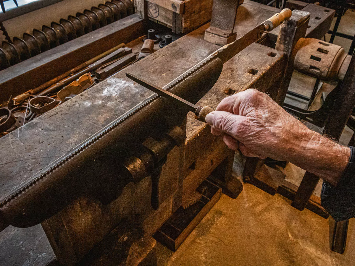 Die Stellmacherei hat ein neues Exponat bekommen, eine Feilkluppe. Nur die wenigsten können heute damit noch etwas anfangen, da Sägeblätter nicht mehr selbst geschärft sondern ausgetauscht werden.