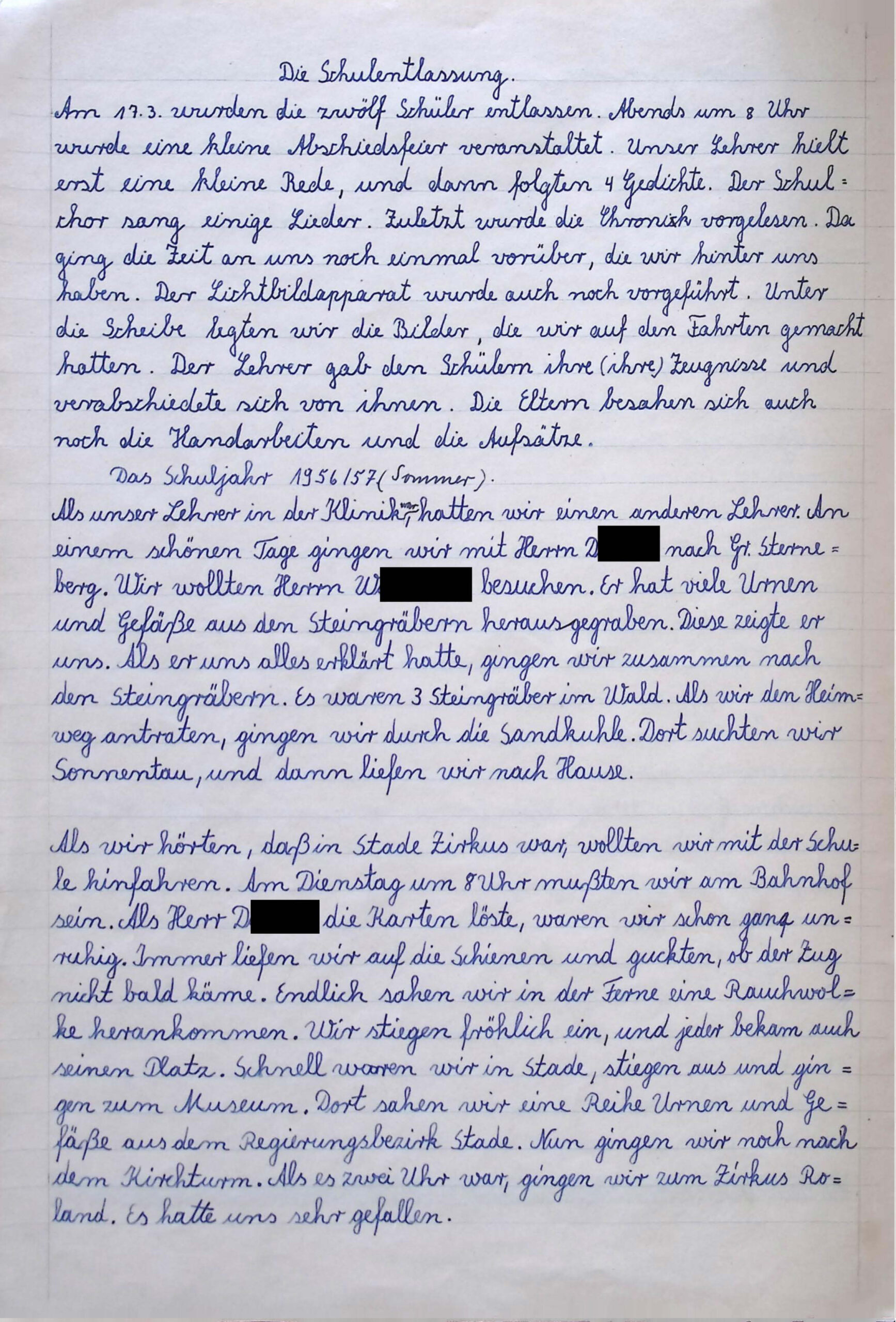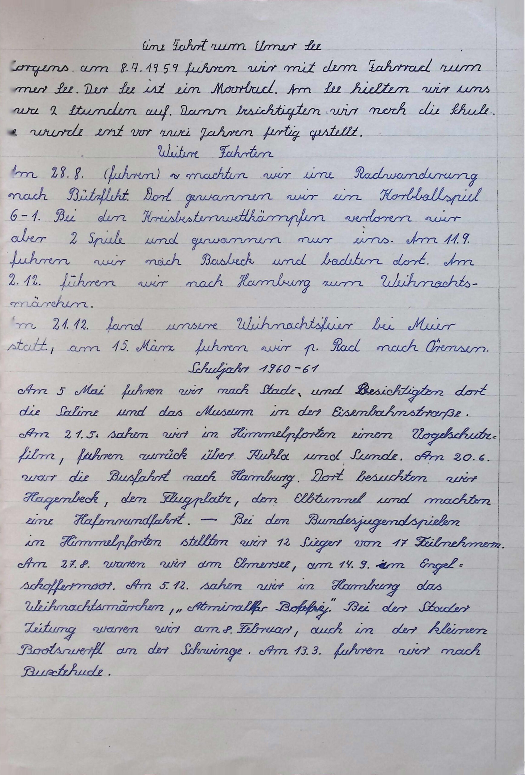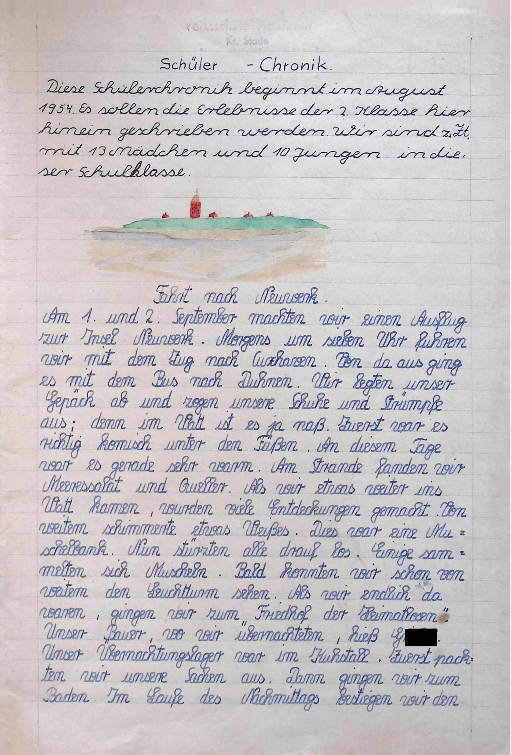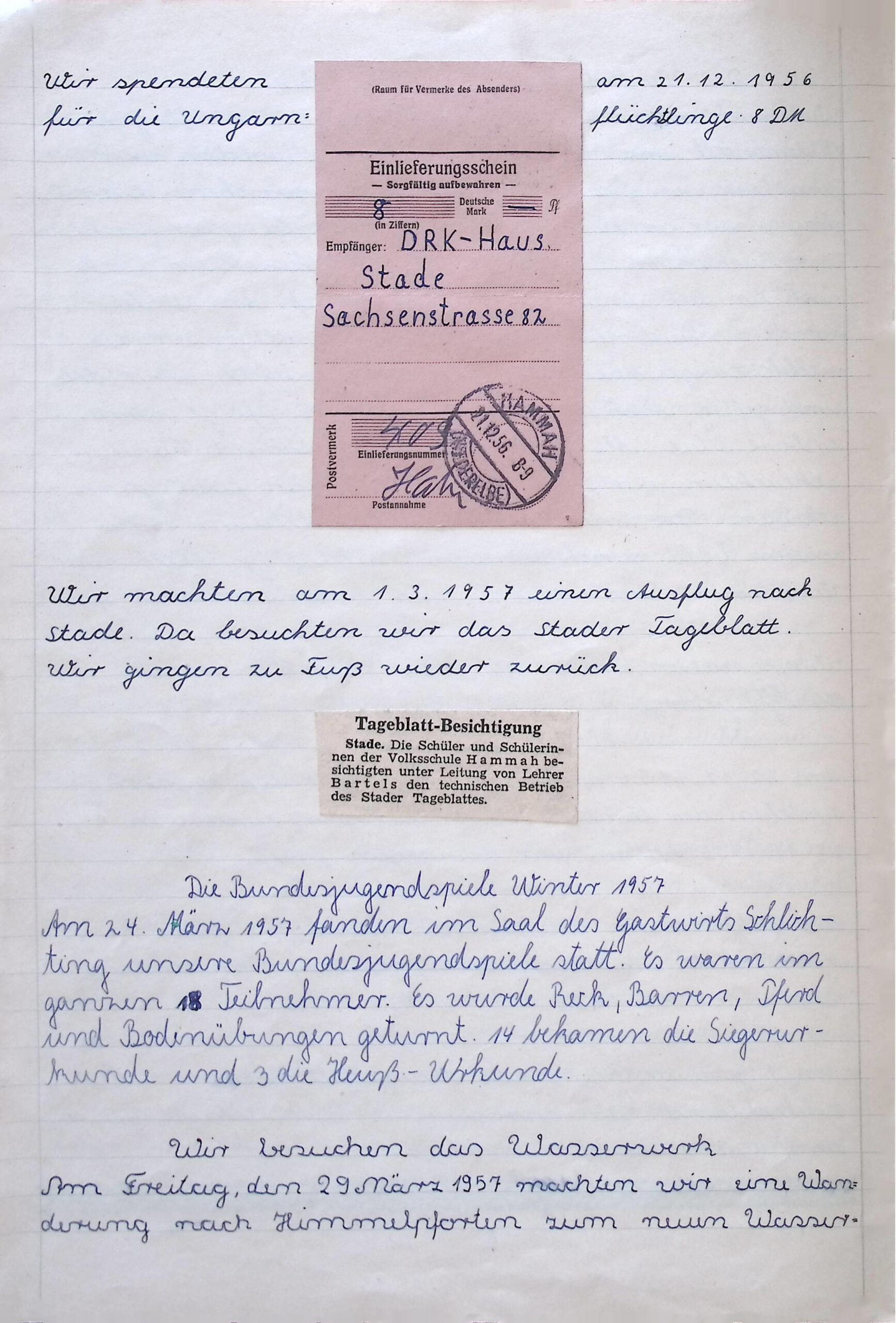 Das Museum erhielt von der Grundschule Hammah eine handschriftliche Schüler-Chronik, die Aktivitäten ab der 2. Klasse enthält. In der 2. Klasse befinden sich zu Beginn 13 Mädchen und 10 Jungen. Es handelt sich um einen Zeitraum von August 1954 bis März 1964. Die Chronik startet mit einer Klassenfahrt im September 1954 mit einer „Fahrt nach Neuwerk“ und endet im März 1964 mit der „Fahrt nach Basbeck“. Dieses Dokument stellt anschaulich den Verlauf von 10 Schuljahren dar und eignet sich hervorragend, als Exponat im Heimat- und Schulmuseum aufgenommen zu werden.