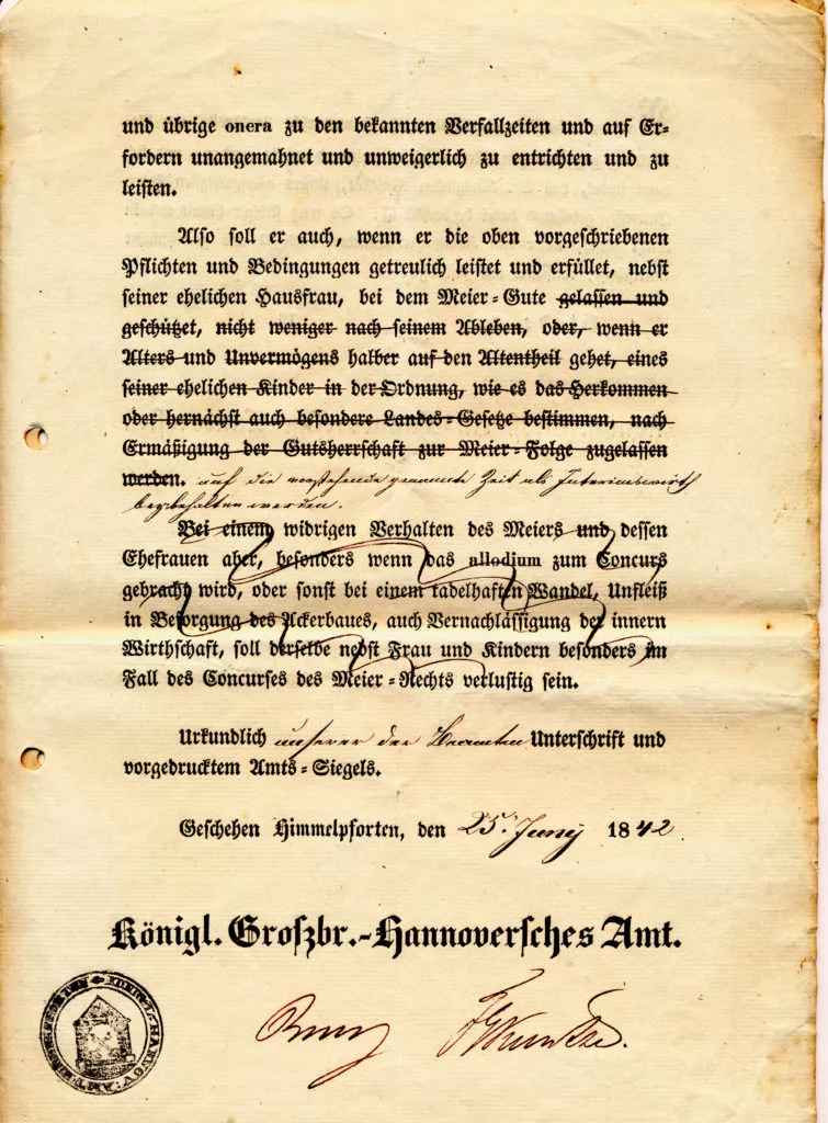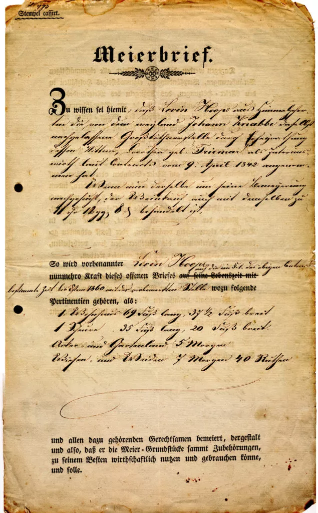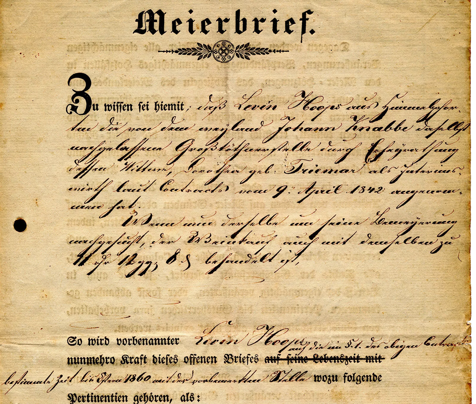 Erst vor kurzem hat unser Museum einen schön geschriebenen Meierbrief aus dem Jahre 1842 bekommen in dem das Königl. Groszbr.-Hannoversche Amt einem "Levin Hoops" einen Meierhof zur Bewirtschaftung überläßt.